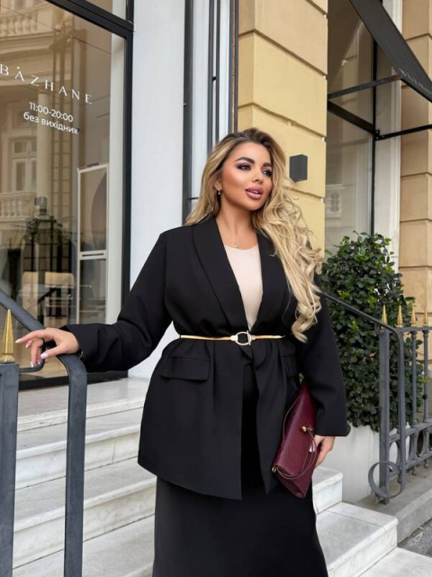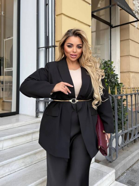 Тканина: Костюмна тканина – щільна, м’яка та тримає форму. Піджак має підкладку та підплечники.
