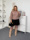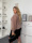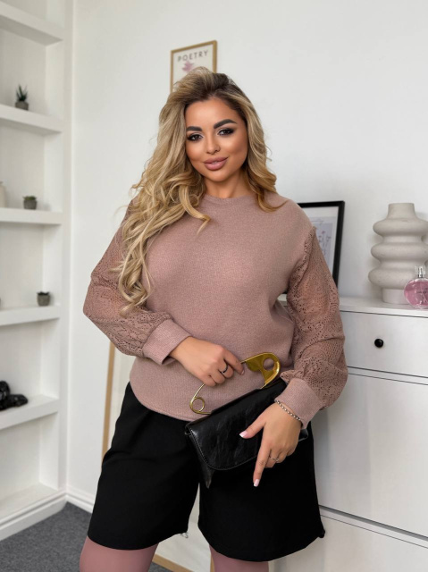 Модель на фото одягнена в 48-50, має параметри 110-88-111, на ній вільного фасону светр
