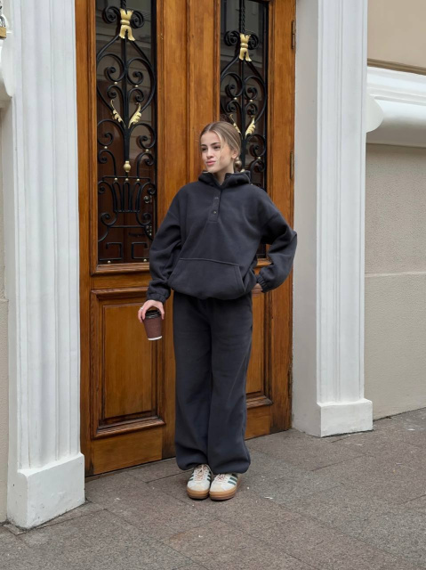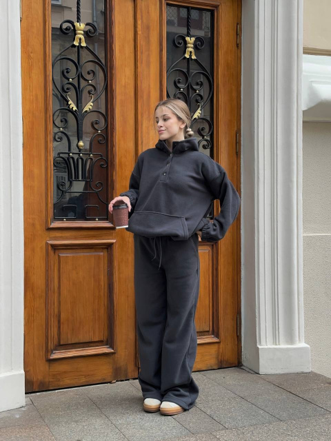 Капюшон подвійний , кофта по низу затягується , штанці на високій посадці вільного крою і також по низу регулюється ширина за рахунок резинок