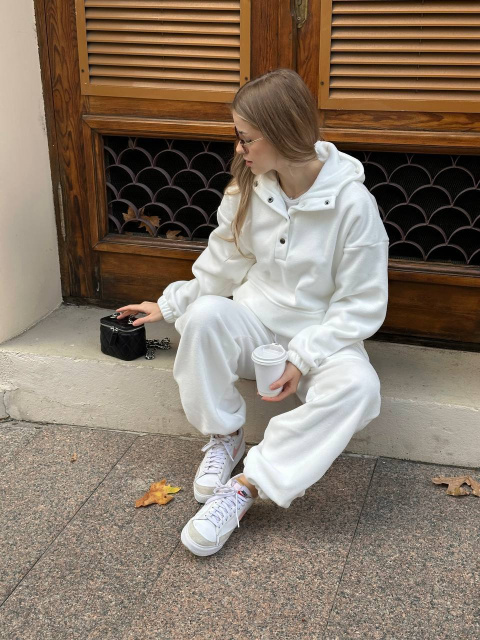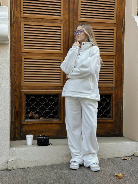 Капюшон подвійний , кофта по низу затягується , штанці на високій посадці вільного крою і також по низу регулюється ширина за рахунок резинок