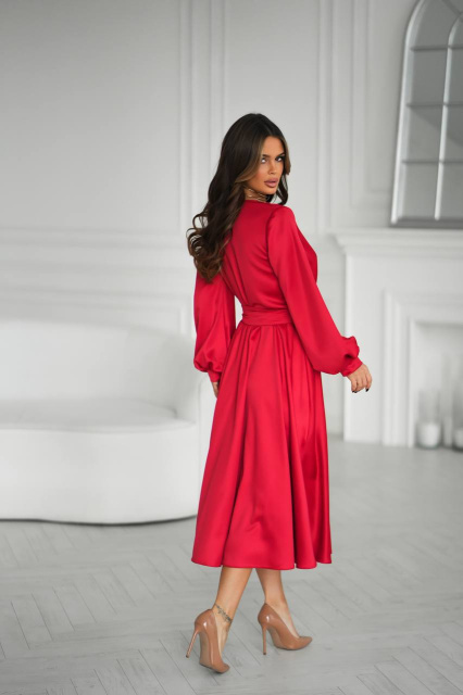 Довгі рукави з манжетами надають образу ніжності, а струмлива тканина красиво грає на світлі, створюючи ефект дорогоцінного шовку