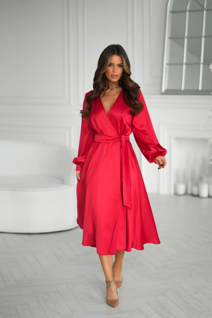 Глибоке V-подібне декольте в поєднанні із запахом м’яко акцентує лінію талії, а пояс додає силуету витонченості.