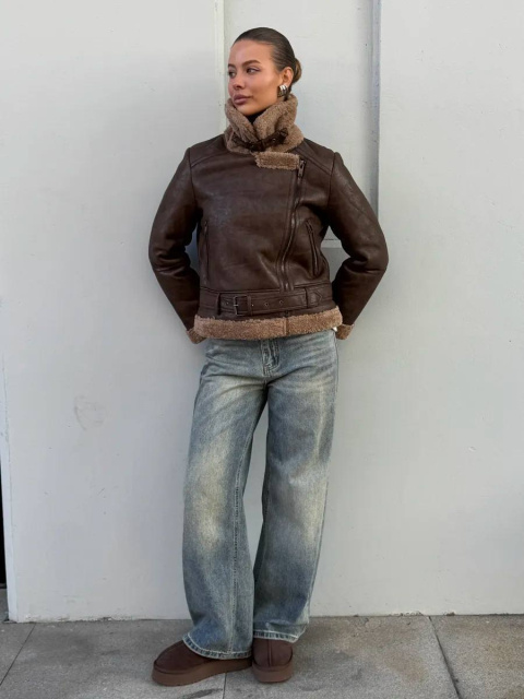 Деталі — коса блискавка, масивний ремінь на талії та комір-стійка, який можна носити як відкритим, так і застібнутим під горло