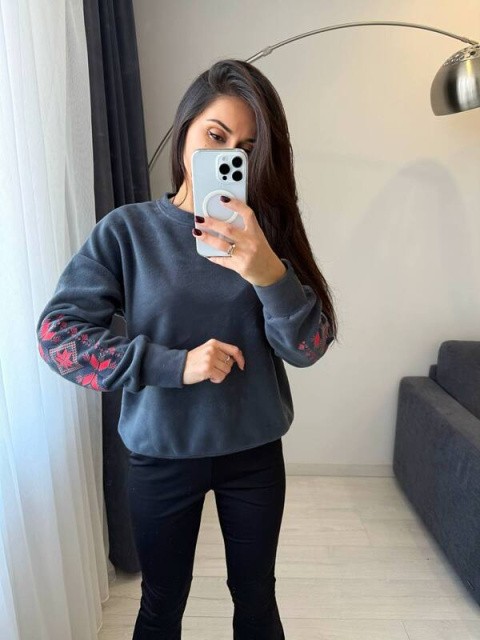 Костюм (кофта+лосини теплі). М’який трикотаж із начосом дарує затишок і тепло, а продуманий крій забезпечує зручність у кожному русі. Кофта з оригінальною вишивкою на рукаві додає образу родзинки, а лосини з високою посадкою красиво підкреслюють фігуру.