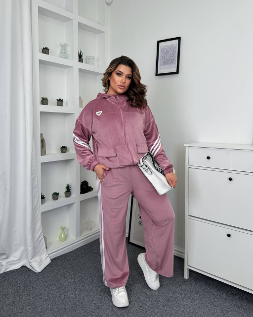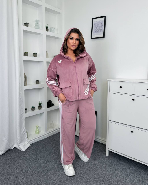 Дуже теплий і приємний на дотик велюровий костюм. Лампаси ідеально доповнюють костюм і роблять його цікавим і стильним. Кофта на молнії, спереду дві кишені, низ затягується на шляпну резинку, є капюшон. Штани на резинці з кишенями з боків.