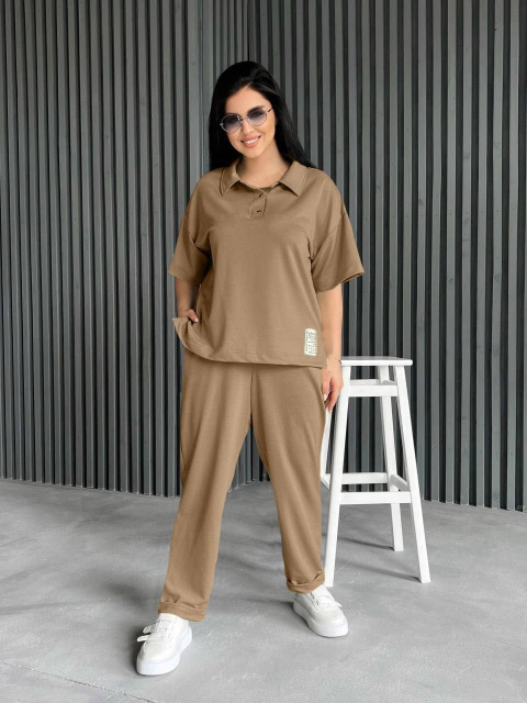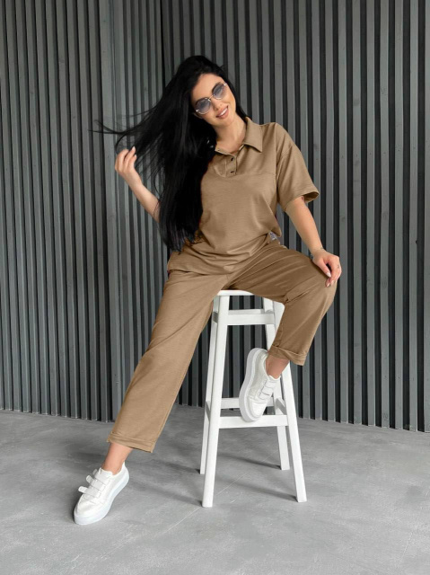 Комфортний прогулянковий костюм з двонитки: брюки та футболка. Брюки мають дві кишені та оздоблені манжетом, пояс на резинцi. Футболка оздоблена нашивкою та двома розрізами по боках, рукав спущений, горловинка застiбається на кнопки та має вilдкладний комiрець.
