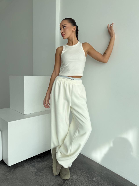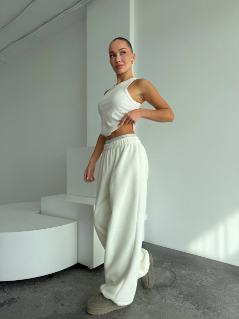 Стильні та комфортні штани вільного крою. Виготовлені з м’якої тканини, мають еластичний пояс на резинці, що забезпечує зручну посадку. Штани прямі, довжиною до підлоги, створюють легкий та розслаблений силует.