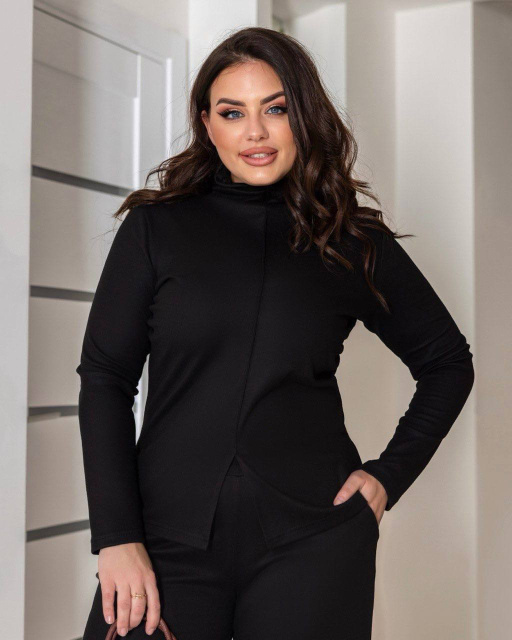 Кофта з високою горловиною,на груді декоративні складки,перед з відстрочкою по середині,а також розрізом.