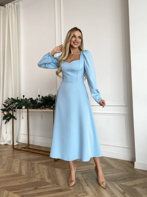 Елегантна міді-сукня із ніжно приталеним силуетом та акцентованим вирізом-сердечком. Довгі об’ємні рукави додають жіночності, а тягнуча тканина забезпечує комфортне та ідеальне прилягання по фігурі. Сукня виглядає святково й водночас стримано — чудовий вибір для урочистостей, вечірок або святкових подій.