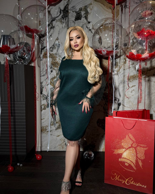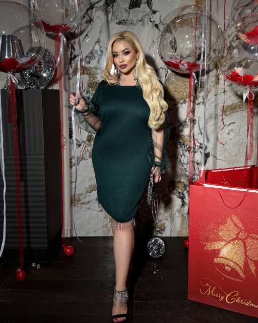 Стильна сукня з двосторонньої ангорки, виготовлена в Україні. Тканина щільна, якісна та еластична. Декор — металева бахрома по спинці та низу, що додає образу святковості. Рукав виконаний із сітки-флок із блискучим напиленням.