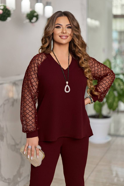 Брючний костюм, створений з особливою увагою до стилю та комфорту жінок. Блуза напівприлеглого силуету. Виріз горловини V-подібний, рукав трохи спущений. Виконаний з м'якого мережива, що надає додаткового шарму. Елегантний дизайн костюма подарує комфорт та впевненість у собі.