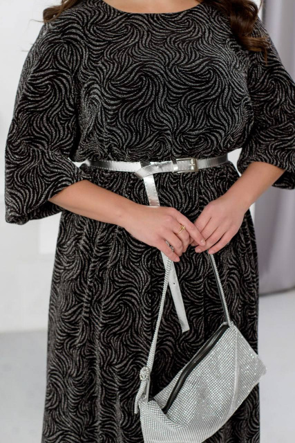 Довга сукня з мерехтливим дизайном — втілення ніжності, жіночності та святкової елегантності. Півкруглий виріз горловини та відрізна лінія талії підкреслюють фігуру, а спадаючі плісовані оборки додають легкості й витонченого руху. Рукави довжиною 3/4 з м’якими резинками на зап’ястках створюють об’єм і делікатний акцент. Вертикальні виточки формують красивий силует, а поясок із комплекту дозволяє обрамити талію, додаючи завершеності образу.