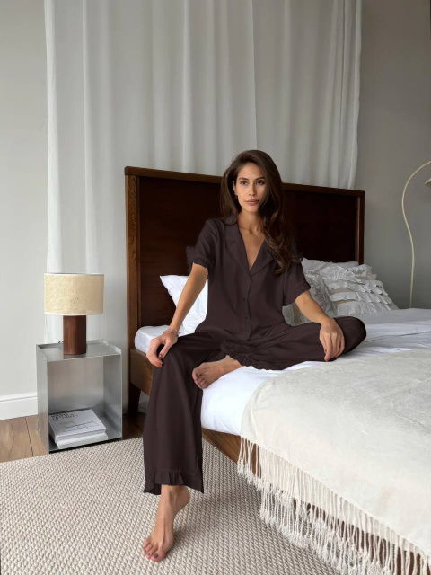 Низ: штани прямого крою з елегантними оборками внизу.