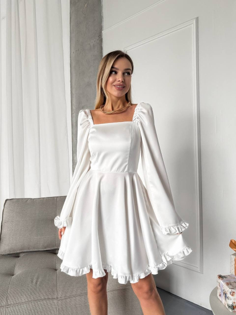 Стильна сукня міні, що поєднує в собі елегантність та легкість. Модель виконана з щільної, якісної тканини, яка не просвічується та чудово тримає форму. Прямий квадратний виріз підкреслює лінію плечей, а об’ємні рукави зі зібраними манжетами та воланами додають ніжності й романтичності.