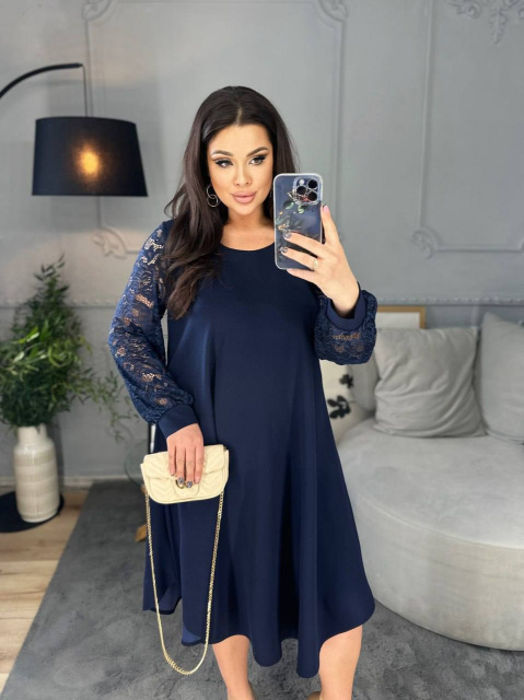 Силует сукні у вигляді трапеції, завдяки чому чудово маскує будь-які недоліки фігури та підкреслює її переваги. Виріз горловини круглий. Рукави на манжетах, виконані із гарного гіпюру в тон основної тканини. Низ сукні асиметричний. Застібок кишень немає.