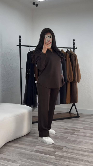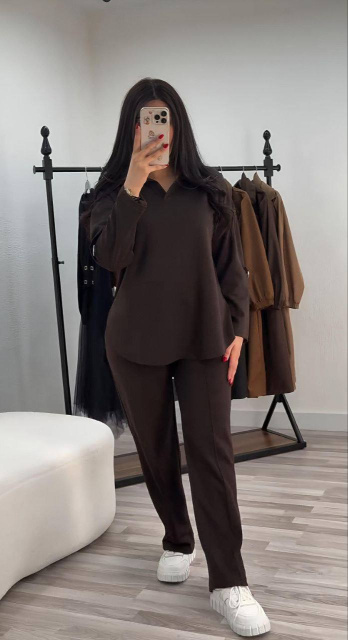 Стильний костюм на щодень. Вільна сорочка з V-вирізом та прямі брюки візуально витягують силует.
